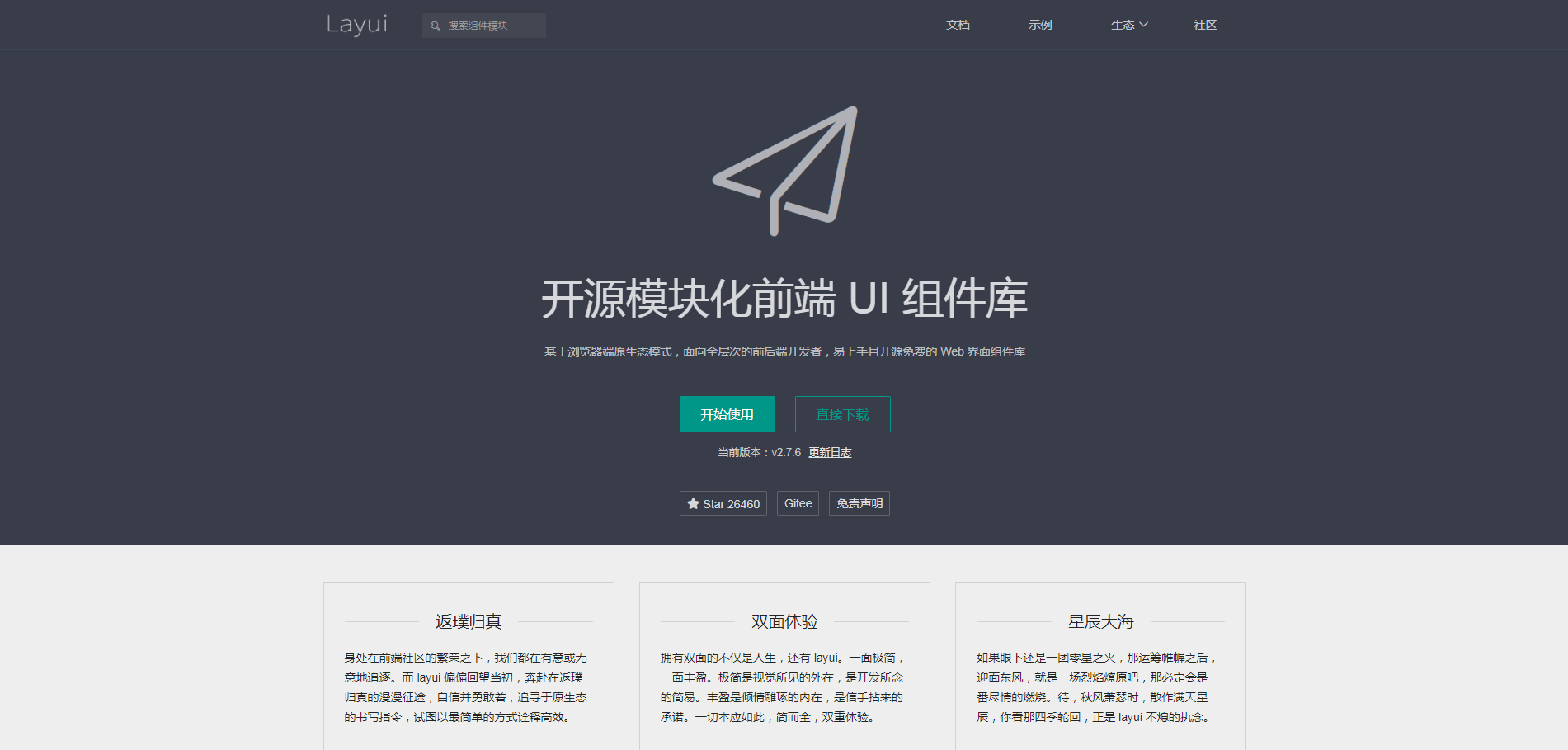 layui(谐音:类 UI) 是一套开源的 Web UI 解决方案,采用自身经典的模块化规范,并遵循原生 HTML/CSS/JS 的开发方式,常适合网页界面的快速开发。layui 区别于那些基于MVVM 底层的前端框架,它更多是面向后端开发者,无需涉足前端各种工具,只需面对浏览器本身,让一切所需要的元素与交互。