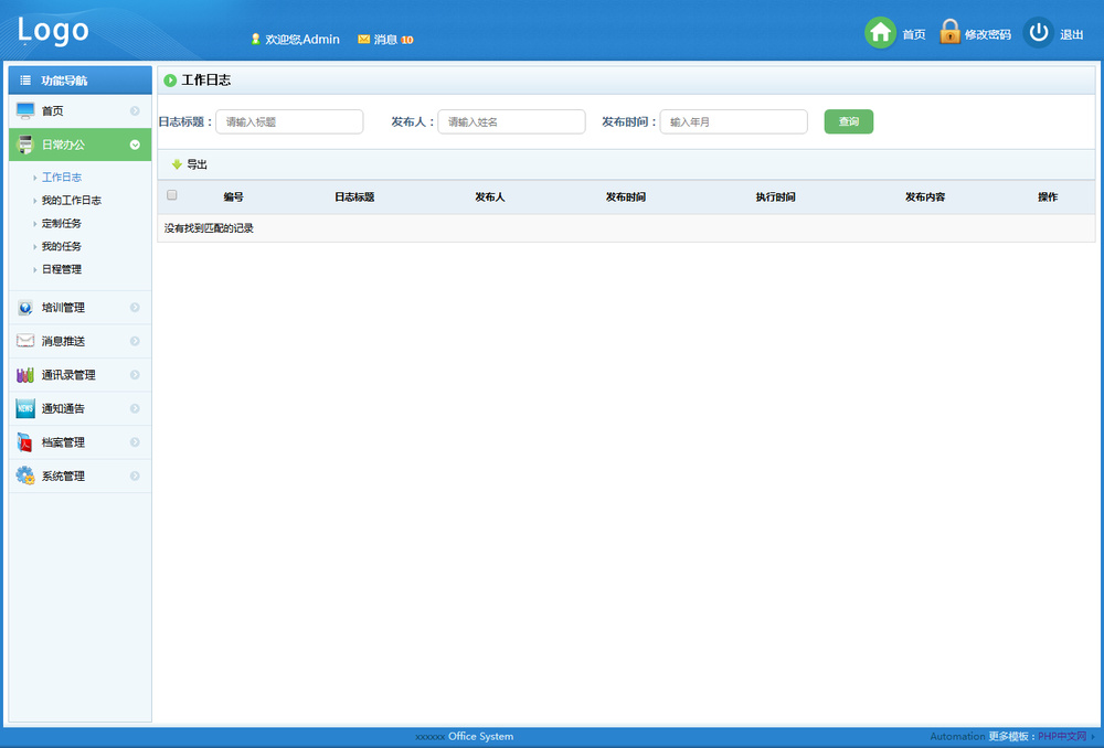 蓝色日常办公OA管理系统后台模板,DIV+CSS布局设计,全套模板,包括登录、日常办公、培训管理、消息推送、通讯录管理、通知通告、档案管理、系统管理等HTML后台模板页面。