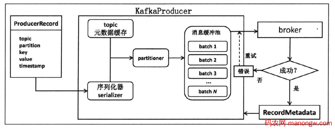 producer使用用户启动producer的线程,将待发送的消息封装到一个ProducerRecord类实例,然后将其序列化之后发送给partitioner,再由后者确定目标分区后一同发送到位于producer程序中的一块内存缓冲区中。而producer的另外一个线程(Sender线程)则负责实时从该缓冲区中提取出准备就绪的消息封装进一个批次(batch),统一发送给对应的broker,具体流程如下图: