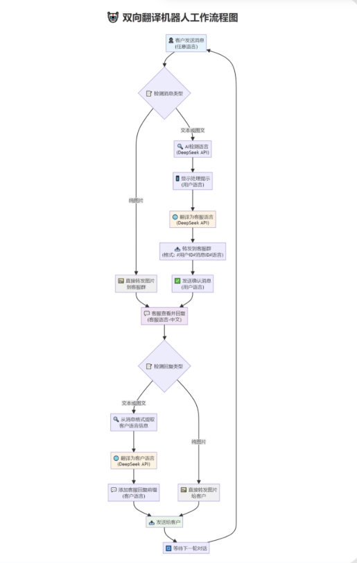 互联网转载 具体未测试 功能说明: 1.双向功能,这个不用说 2.将客户消息翻译为客服配置的指定语言,不管客户消息是哪个国家的语言,只要是deepseek能识别的语言都可以。 3.将客户发送的消息翻译为符合客户国家口语习惯的语言