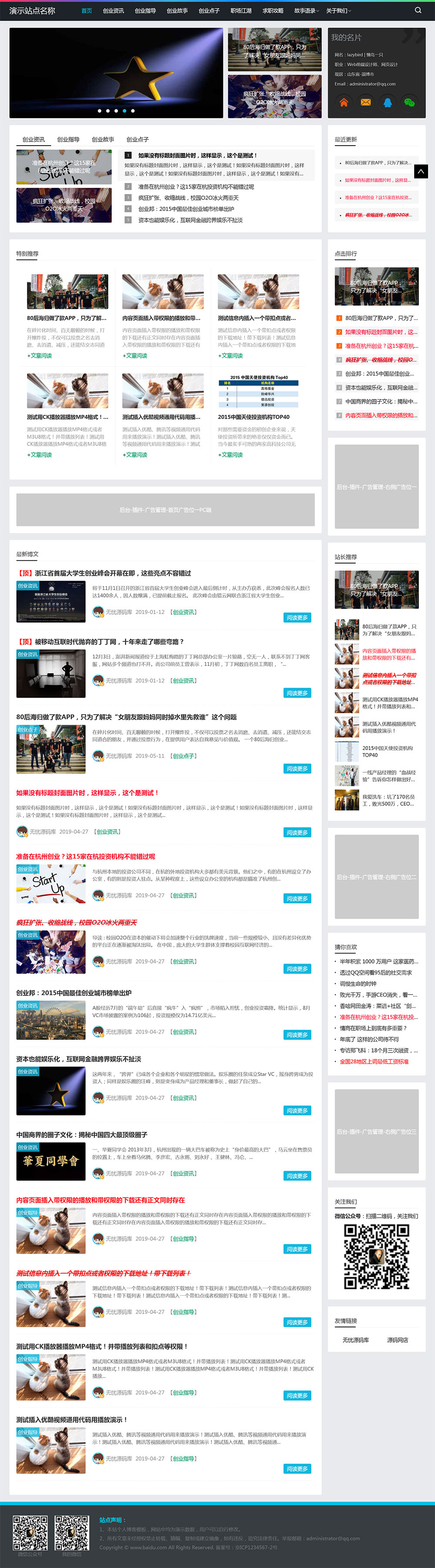 本模板采用帝国cms7.5新内核,手机端自适应,是一套比较好看的个人博客网站模板。(站长已测试) 本模板采用帝国cms7.5新内核,手机端自适应,利于网站移动端优化。安全和性能都比较好,是一套比较好看的个人博客网站模板。 新增图文列表页面模板和时光轴页面模板,让页面看起来更多样化。